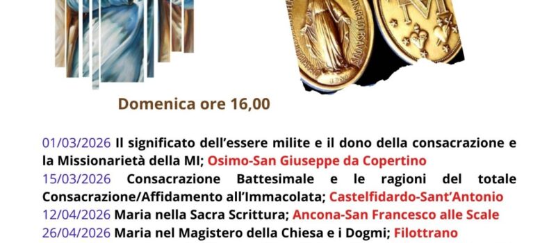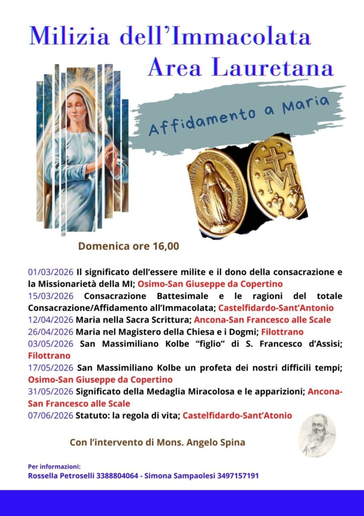 Carissimi militi e amici, vi informiamo che a partire dal 1° marzo 2026 prenderà avvio il percorso di formazione in preparazione alla Consacrazione/Affidamento, che coinvolgerà tutti i gruppi dell’area Lauretana: Ancona, Castelfidardo, Filottrano e Osimo.