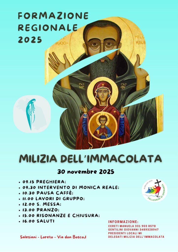 Domenica 30 Novembre 2025, dalle ore 9.15, presso l’Istituto Salesiano di Loreto si terrà la Formazione regionale. Questo incontro sarà un’occasione privilegiata per approfondire la nostra spiritualità e il nostro cammino nel carisma della Milizia dell’Immacolata.